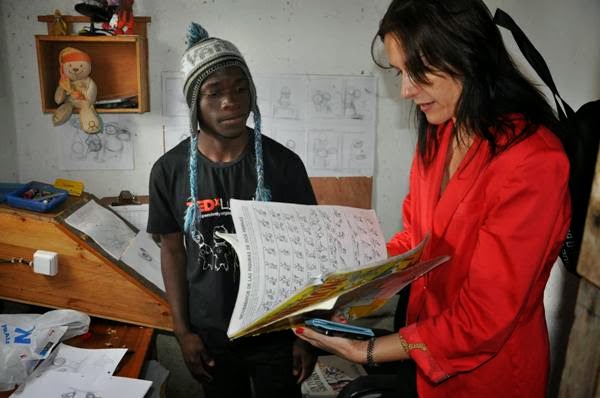 | Beata Angélica, Assistente de Relações Públicas da Embaixada dos E.U.A. em Angola visitou a Okutiuka por ocasião da exibição do filme "Death Metal Angola" no Huambo. Aqui: com o BV, jovem dotado para o desenho e ambiciona fazer mais tarde desenho de animação |